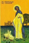 Un’altra antica leggenda spiega il perchè l’oca sia divenuto l’emblema principale di questa santa: un gruppo di oche selvatiche devasto i raccolti di Weedon e Vereburga le fece catturare, ma dopo che nottetempo un servo ne uccise una e la cucinò, la santa la riportò in vita. Lo stormo di animali poi fuggì, senza più tornare a rovinare i raccolti. Le reliquie di Santa Vereburga vennero nuovamente traslate nella cattedrale di Chester nel 1095, cioè pressapoco quando Goscelino scrisse la sua Vita, ove questa leggenda è raffigurata su una mensola d’appoggio di un sedile del coro: al centro vi è la santa con un bastone pastorale in mano, mentre un servo le porge un’oca; sulla destra un uomo confessa di aver rubato l’animale, mentre a sinistra si scorgono le altre oche rinchiuse. Questa storiella in realtà era già stata utilizzata dallo stesso autore nella Vita di Santa Amalberga.