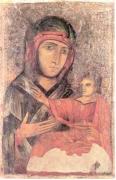 L’icona della Madonna di San Luca giunge in città verso la fine del XIII secolo. È questo il periodo che vede la nascita del Santuario della Beata Vergine di San Luca a Bologna. Trasportata da un devoto pellegrino, l'immagine viene affidata in seguito dai maggiorenti della città ad alcune monache di un convento sul Colle della Guardia che si adoperarono di adornarla con fiori e gioielli. La devozione popolare converge verso questa icona raffigurante una Madonna con il Bambino secondo la classica iconografia orientale di tipo odigitria, anche in virtù di intensi contatti tra le correnti orientali e occidentali. Secondo la consolidata iconografia, la Madonna, rappresentata a mezzo busto, tiene in braccio Gesù benedicente. La Vergine porta una veste di colore blu-verde, sotto la quale si intravede una sottoveste rossa. I tratti del viso sono allungati, le dita della mano affusolate. Il Bambino, dalla testa piccola rispetto al corpo, ha il braccio destro atteggiato nel gesto di benedizione, mentre la mano sinistra è chiusa a pugno. La tunica del Bambino è dello stesso colore rosso della sottoveste della Vergine. Sullo sfondo si notano filari di piccole foglie d'edera, inseriti l'uno nell'altro e intervallati da piccole perle. Due fasce laterali di circa 4 cm decorate con motivi floreali contornano la tavola, mentre la parte superiore appare tagliata.