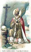 S. Gregorio, soprannominato Taumaturgo, nacque al principio del secolo III in Neocesarea del Ponto. I suoi genitori, illustri per nobiltà e ricchezze, ma idolatri, lo allevarono, assieme al fratello Atenodoro, nelle pagane superstizioni. Ma la Provvidenza Divina che aveva prestabilito di farne due grandi luminari della Chiesa, dispose che ancora fanciulli trovassero la verità e la vera religione. Dotato di grande penetrativa e di una sete inestinguibile di sapere, Gregorio fu messo a frequentare la scuola di filosofia del celebre Origene. Alla luce di quelle lezioni tanto eloquenti, la sua mente logica fu rischiarata e ben presto volle essere battezzato. Approfonditosi in modo particolare nello studio della Sacra Scrittura, deliberò di consacrarsi interamente al divino servizio e di rinunziare a ogni vantaggio terreno. Infatti, mentre era ancora a Cesarea, la morte gli rapì i genitori, ed egli trovandosi padrone di molte ricchezze, ne fece parte alle vedove e agli orfani e si ritirò in una solitudine. La penitenza, la preghiera e la studio della Sacra Bibbia furono i suoi grandi mezzi per salire alla contemplazione e alla perfezione. Non potè tuttavia rimanere ignoto, poichè la fama dei suoi consigli e delle sue virtù giunse agli orecchi del santo vescovo Fotino, che per speciale rivelazione dello Spirito Santo, lo volle far risplendere sul candelabro della Chiesa, creandolo vescovo di Neocesarea. Invano tentò ripetutamente di sottrarsi al grave peso; ma conosciuta essere quella la volontà di Dio, dopo una conveniente preparazione, fece l’ingresso nella sua popolatissima città, che non contava però più di 17 cristiani. Nondimeno la sua fama di uomo straordinario aveva incoscientemente preparato quel popolo idolatra al culto del vero Dio; e da parte sua il Santo non risparmiò sforzi, preghiere e specialmente miracoli per affrettarne la conversione. Ne riportiamo qualcuno. Si trattava di costruire il primo tempio cristiano; ma il fiume da un lato e la montagna dall’altro rendevano angusto il luogo. Il Santo comanda al monte di scostarsi, e il monte docilmente si sposta quanto è necessario. Il popolo si lagnava che una palude, già causa di discordie tra fratelli, rendeva insalubre il clima. Gregorio con il segno di croce la fa divenire fertile campagna. In una piena, il torrente di Casalmacco ruppe gli argini e minacciava l’abitato: vi accorre il Santo, pianta in terra il suo bastone, le acque si ritirano nel loro alveo e il bastone diviene robustissima pianta. I tanti prodigi del taumaturgo vescovo non valsero a salvarlo dalla persecuzione di Decio, nè dall’esilio. Di là vigilava e pregava per la perseveranza del suo gregge nella fede. Conosciuta poi, per divina rivelazione, l’ora della sua morte, comandó di fare diligente ricerca di quanti pagani rimanessero ancora nella sua diocesi, e saputo ch’erano 17 esclamò: “Deo gratias, alla mia venuta trovai appunto 17 cristiani!”. Dopo 25 anni di episcopato chiuse placidamente gli occhi nel Signore. Era l’anno 270.