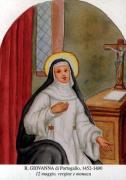 Giovanna, figlia di Alfonso V, Re del Portogallo, fu implorata dal cielo con molte preghiere, perché mancava l’erede alla corona. Alla sua nascita, nel 1452, i tre stati di quella corona giurarono di riconoscerla come loro Principessa ed erede al Trono, in caso venisse a mancare la prole maschile. A tre anni Giovanna restò senza mamma, la quale morì dando alla luce l’erede atteso. L’augusta bimba crebbe come fiore d’altare squisitamente educata dalla Principessa, Donna Beatrice de Meneses, sua istitutrice. L’ardente pietà e la purità angelica davano un incanto particolare alla straordinaria bellezza di Giovanna, che giovanissima fu chiesta in sposa da ben tre pretendenti, il Delfino di Francia, Massimiliano d’Austria e dal Re d’Inghilterra. Ma essa, scossa da un amore più grande, aveva già stabilito in cuor suo di vestire le bianche lane Gusmane. Il suo rifiuto fu reciso. Allora cominciò quella lotta eroica che le costò indicibili amarezze, per ottenere la libertà di dedicarsi tutta a Dio. Non si trattava di espugnare soltanto il cuore paterno, ma tutto il regno che si opponeva al suo disegno, essendo essa Principessa prescelta, e al mancare del fratello, unica erede del Trono. Solo il 4 agosto 1472 poté vestire l’Abito Domenicano nell’osservantissimo Monastero di Aveiro, dove la sua breve vita fu tutto un olocausto d’amore e di sacrificio. Morì all’ora da lei predetta il 12 maggio 1490, ad Aveiro. Alla recita delle Litanie dei Santi, giunti all’invocazione “Omnes Sancti Innocentes, orate pro ea”, alzò gli occhi al cielo e spirò dolcemente. Sulla sua tomba fiorirono miracoli senza numero. Papa Innocenzo XII il 31 dicembre 1692 ha confermato il suo culto.