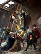 Feriti e seminudi, i prigionieri furono trasportati a Dordrecht su una fetida imbarcazione usata per la pesca delle cozze, dove furono esposti, dietro pagamento, al ludibrio dei curiosi. Condotti poi a Brielle, giunsero nel porto della cittadina affamati e esausti. L’eccezionale trasporto destò un grande interesse tra i locali, attratti dal considerevole numero di sacerdoti e religiosi, pubblicamente umiliati dal Lumey davanti alla folla. Costretti in una farsesca processione ad ag-girare il patibolo issato nel porto cantando canti spirituali sotto i colpi di mazza dei geuzen, i prigionieri furono fatti sfilare per l’intera città tra lo scherno e la derisione di soldati e cittadini. Giunti innanzi al patibolo nella piazza del mercato, i religiosi furono nuovamente costretti ad inscenare il sacrilego rito intorno al patibolo e a inginocchiarsi davanti ad esso, in una crudele quanto malevola caricatura dei riti cattolici: alcune donne, parodiando il rito dell’aspersione, bagnavano una scopa in un secchio d’acqua per poi schizzare con essa i chierici al loro passaggio. Quando si inginocchiarono davanti al patibolo, la folla ebbe la sensazione di aver raggiunto il culmine della solennità sacrilega. In attesa di una conclusione, boia e presenti tacquero. Fu il reverendo Govaart van Duynen, un sacerdote devoto, sia pure sofferente di un lieve disturbo psichico, a rompere il silenzio e a cantare, percependo la notevole delicatezza del momento, un’orazione alla Vergine Addolorata, a mo’ di canto finale. I prigionieri furono, quindi, rinchiusi in un piccolo cella nauseabonda, dove trovarono il parroco e il cappellano di Monster, entrambi Premonstratensi, e i parroci di Heijnenoord e Maasdam. Nei giorni che seguirono, l’intero gruppo fu a più riprese interrogato e interpellato sulle sue convinzioni di fede, con particolare insistenza sul ruolo della Bibbia e il significato dell’Eucaristia. Celebre divenne il colloquio sulla religione che Lumey fece tenere nel Palazzo Comu-nale di Brielle fra alcuni rappresentanti dei prigionieri e due pastori calvinisti, nel quale Nicola Pieck e Leonardo Veghel riuscirono ad avere pubblicamente la meglio sugli avversari. Dovette essere molto doloroso per il Pieck e i suoi il fatto che uno dei pastori calvinisti era un sacerdote di Brielle ex-confratello nel ministero: nell’efferato clima politico-religioso allora vigente nei Paesi Bassi non tutti i sacerdoti vollero – o, forse, osarono – rimanere fedeli al cattolicesimo e al loro stato ecclesiastico, ma alcuni abbracciarono per entusiasmo, paura o calcolo la nuova dottrina per appariva agli occhi dei geuzen come pastori o comandanti di brigata. Sta di fatto che anche sui prigionieri di Gorcum si fatta grande pressione affinché abbandonassero la fede cattolica. Il Lumey, che nella sua lucida quanto imprevedibile malvagità, nutriva una forma di personale disprezzo per i chierici cattolici, che condannava a morte con spietati atti di giustizia sommaria, pareva ormai spinto da tale livore nei confronti dei prigionieri di Gorcum da lasciar credere che non si sarebbe mosso a clemenza neppure se questi avessero abiurato dal cattolicesimo. Alcuni chierici, infatti, tra cui il giovane novizio francescano Enrico, sembravano manifestare qualche simpatia per le idee protestanti e furono, perciò, temporaneamente separati dal resto del gruppo, nella speranza che rinnegassero la loro fede. Il fatto non era insolito nei Paesi Bassi del XVI secolo, in cui lo scisma religioso divideva anche drammaticamente i nuclei familiari: due dei fratelli dello stesso Nicola Pieck erano diventati protestanti. Per amore del fratello, tuttavia, si recarono a Brielle per liberalo, riuscendo a strappare la promessa che il fratello sarebbe stato risparmiato, se avesse rinnegato la fede cattolica. Nella casa di uno dei carcerieri cercarono per una notte intera di convincerlo a prendere le distanze almeno da uno dei punti della dottrina cattolica. Il colloquio si concentrò sulla posizione del Papa: i fratelli di Nicola fecero presente che il Papa era soltanto un uomo e che sarebbe stato folle morire per qualcuno che per lui non avrebbe, invece, sacrificato alcunché, ma nonostante i tentativi, Nicola non volle in nessun modo recedere dalle sue convinzioni di fede. L’episodio valse ai Martiri di Gorcum anche il titolo di testimoni del Primato del Papa. Nel frattempo, parenti e amici dei chierici di Gorcum avevano cercato di spingere i magistrati cittadini a invocare l’aiuto del comandante in capo dei geuzen, il principe d’Orange. Questi, peraltro, indipendentemente da ciò, aveva già impartito ai suoi l’ordine di non molestare i chierici cattolici. Quando tale ordine giunse a Gorcum, fu inoltrato velocemente a Brielle e presentato al Lumey, il quale, indispettito dall’ingerenza, rifiutò di sottomettersi al principe e diede ordine di giustiziare i prigionieri. Nella notte tra l’8 e il 9 luglio Jan Omal fece uscire dalla prigione i chierici per eseguire la sentenza di morte. Il novizio Enrico, detenuto separatamente, vedendo i suoi confratelli partire, si associò a loro volontariamente. Fuori città, nelle vicinanze del borgo di Rugge, presso il convento agostiniano precedentemente distrutto dai geuzen, in un capannone destinato alla raccolta della torba, poco dopo la mezzanotte, l’Omal pose fine con l’impiccagione alle sofferenze dei martiri: per rompere la resistenza del gruppo, furono uccisi prima Nicola Pieck e gli altri portavoce,mentre un pastore calvinista cercava invano di incitare i prigionieri all’apostasia fin negli ultimi istanti, gettato a calci giù per la scala del patibolo dal vice-guardiano Girolamo da Weert a cui, per ritorsione,furono strappati dalla pelle i tatuaggi che si era fatto fare durante il suo pellegrinaggio a Gerusalemme. Alcuni che, secondo i geuzen alzavano troppo la voce, furono impiccati con il cappio fatto passare intorno alla bocca, anziché intorno al collo, finendo p