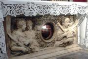 Nel 1661 si trovavano a Roma due membri della famiglia dalla Porta, originaria di Virgoletta (MS): Gabriele, nato nel 1617 che partecipò come chirurgo ai conclavi del 1667 e 1670 e fu medico personale dei papi Celmente IX, Celmente X e Innocenzo XI, e suo zio Mattia, canonico della basilica di Santa Maria ad Martyres (il Pantheon) per sessantun anni; Mattia era a sua volta nipote di Alessandro, cuoco e amico di Paolo V Borghese. Fu grazie a loro che la confraternita parrocchiale del SS.mo Sacramento di Virgoletta, da poco eretta secondo le esortazioni del Concilio di Trento, ricevette il dono di quattro corpi santi, numerose altre reliquie e molti arredi sacri d’argento, paramenti per le celebrazioni liturgiche e lo stesso altare marmoreo che custodisce come un grande reliquiario i corpi di Fausto, Agatopo, Pellegrina e Quinta. Le prime reliquie a giungere a Virgoletta furono in quell’anno le cassette con le ossa di Fausto e Quinto; in seguito, nel 1666, giunsero quelle di Agatopo e Pellegrina, da essi ricevute nel 1662 e nel 1663 da mons. Ottaviano Caraffa. Conosciamo i nomi e qualche breve informazione sulla storia di questi santi grazie alle iscrizioni delle lapidi sepolcrali che vennero fedelmente copiate e in seguito incise nel marmo dell’altare. Il putto di destra regge dietro le spalle due cartigli; di essi, quello verso la navata, di forma alquanto irregolare, riporta il testo più lungo che è quello riguardante Agatopo: “Agatopo, pastore, nato il 26 marzo, visse vent’anni e sette mesi. I genitori addolorati, Agape e Teodoro, per il proprio figlio posero. Sia accolto da Dio”. Il cartiglio verso il coro, che nella parte alta ricorda in modo più realistico l’arrotolarsi della carta, riguarda, invece, “Fausto, presbitero”, al cui nome non segue alcun’altra indicazione se non il monogramma di Cristo e “M.”, che significa presumibilmente “martire di Cristo”. Dalla parte opposta, il putto regge verso il coro il cartiglio con la strana scritta riferita alla piccola Quinta: “Quinta che visse quindici anni, G.Q.S.M.”. Mentre, con la mano rivolta verso la navata impugna il cartiglio appartenente a Pellegrina, suggerendo di esso una consistenza simile a quella di un tessuto: “Pellegrina. Visse in pace quarantadue anni e novantacinque giorni”. Nei documenti che possediamo, cioè il testamento del canonico Mattia dalla Porta del 1664 e l’autenticazione diocesana delle reliquie del 1662, si parla inequivocabilmente di Quinto, mentre il cartiglio dell’altare parla di Quinta, anche se il nome è seguito dal relativo maschile “qui”, e, del resto, nel paliotto dello stesso altare sono rappresentate due figure maschili e due femminili: Fausto, Agatopo, Pellegrina e, appunto, Quinta. È un giallo tuttora irrisolto come sia potuto avvenire nel giro di pochi anni questo cambiamento. Ad ogni modo, Gabriele ottenne dal cardinale vicario Gaspare di Carpegna altri reliquiari che mandò prontamente a Virgoletta negli anni seguenti: uno di lamine dorate e vetri con le reliquie di santa Vittorina e due di legno dorato e vetri con le reliquie dei santi Benigno, Amico, Uberto, Giacinto, Dionisio, Claro, Candida, Concordio, Vito, Valeria, Venanzio, Vittore, Vittoria, Eufemia, Vitale, Claudio, Clemente e Giuliano. Pur non trattandosi di corpi integri, queste reliquie possono essere fatte risalire alla categoria dei corpi santi grazie a un passaggio dell’autentica che li dichiara provenienti “ex coemeterio Praetextati”, uno dei più famosi tra gli antichi cimiteri sotterranei di Roma rinvenuti proprio in quegli anni. Nel 1748 si aggiunsero al sacro tesoro due urne: l’una con le reliquie dei santi Eutropio e Reaparato e l’altra con quelle dei santi Generoso, Sereno, Degna e Pia, tutte estratte dal cimitero di san Callisto e, di conseguenza, appartenenti anch’esse a pieno titolo alla categoria dei corpi santi. Le reliquie presenti nella chiesa parrocchiale dei santi Gervasio e Protasio di Virgoletta sono custodite in un luogo apposito a destra dell’altar maggiore, fatta eccezione per quelle di Fausto, Pellegrina, Agatopo e Quinta, che sono state poste sotto l’altar maggiore protette da una cancellata che originariamente aveva ben quattro chiavi: una tenuta dal parroco, secondo le disposizioni sinodali della diocesi, una dal priore della confraternita del SS.mo Sacramento, che era la destinataria di tali doni, una dai marchesi Malaspina di Villafranca nel cui territorio rientrava Virgoletta, e una dagli eredi di Antonio dalla Porta a nome di Gabriele. Dal 1680, sempre per dono di Gabriele, i quattro corpi santi riposano dentro un’urna in oricalco collocata nel vanno sotto l’altare maggiore. Nel 1821 il parroco di Virgoletta, don Francesco Trombella, redigendo la memoria per la visita pastorale, descrisse anche la modalità in cui in quel tempo avveniva (e avviene tuttoggi) la venerazione delle reliquie dei quattro corpi santi, cioè girando attorno all’altare per raggiungere l’ampia apertura verso il coro che permette di vedere la grande urna di metallo prezioso che racchiude le quattro cassette di legno ricoperte di vari tessuti. Oggi, nel giorno della festa che cade la seconda domenica di maggio, insieme ai numerosi reliquiari, viene portata in processione anche la reliquia della santa croce, permettendo a chi vi partecipa di fare una chiara esperienza visiva dell’immensaa schiera degli eletti che segue l’Agnello ovunque vada (cfr. Ap 14,4).