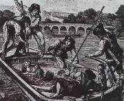 I sacerdoti vengono condotti all'interno di una chiatta manomessa (barca a fondo piatto). Poco sorpresi dall'ennesimo trasferimento, rimangono calmi e obbediscono saggiamente quando gli viene chiesto di salire sul ponte. Perquisiti e poi spogliati dei loro oggetti di valore, che tutti accettano di buon grado di consegnare, immaginano addirittura di poterli poi recuperare. Solo il prete di Machecoul si preoccupò quando vide strani ciottoli sul fondo della barca; l'uomo di fede, vedendo l'acqua filtrare intorno alle pietre e intravedendo improvvisamente un cattivo presagio, consiglia ai suoi confratelli di darsi reciprocamente l'assoluzione sacramentale. Lamberty e i suoi scagnozzi quindi tirano fuori la barca in mare prima di rompere i bordi con un’ascia per far entrare l’acqua. Pietre sospette in realtà coprono buchi nello scafo, la forza dell'acqua li sposta e sorgono veri e propri geyser; bastano pochi minuti per affogare i prigionieri. Non solo non sapevano nuotare (a quei tempi pochissimi sapevano farlo), ma cosa potevano fare, attaccati l’uno all’altro tanto quanto appesantiti dalle loro tonache di juta?